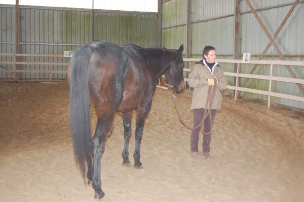 Dimanche : le cheval s'appelle Madison, pur sang irlandais de 8 ans, son propriétaire l'a acheté il y a un mois et il souhaite juste avoir plus de respect de la part de son cheval qui le ballade pas mal à pied, qui s'appuie sur le licol, n'avance pas vraiment bien en main. En fait Julien a appris à composer avec son cheval et n'arrive pas vraiment à prendre le pas sur lui.